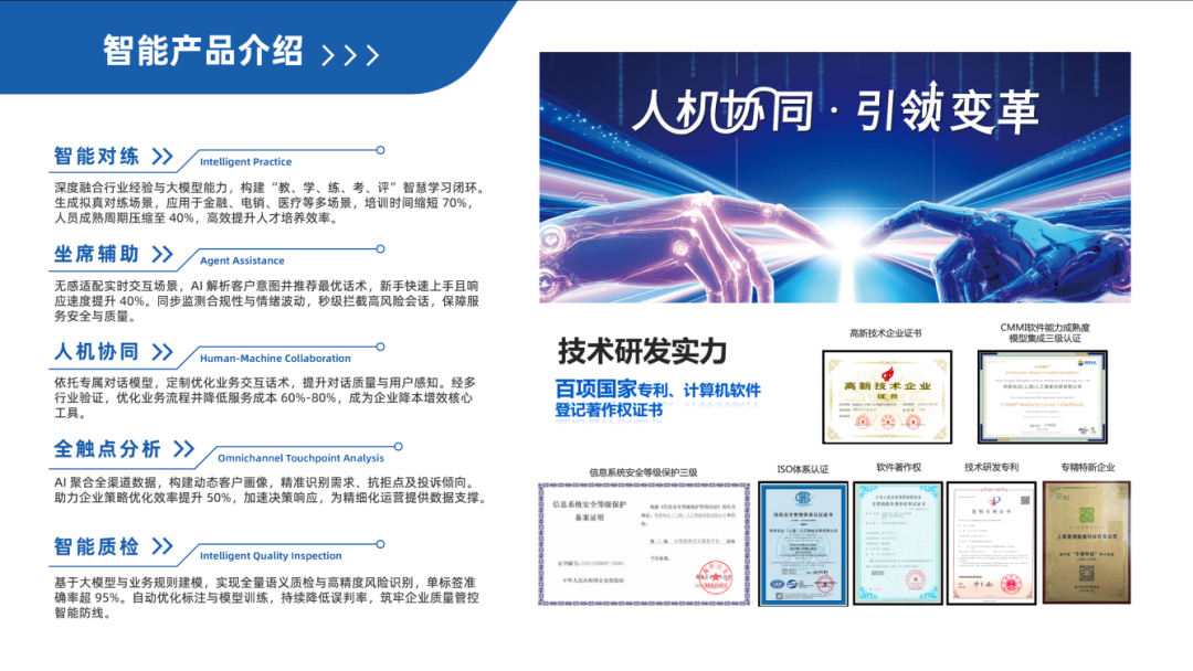 自2018年布局人机协同,到2023年战略投入大模型平台,我们持续推动垂类大模型在金融、基金证券、电商、催收等核心业务场景中的深度落地。通过高度定制化的AI解决方案,我们帮助客户构建更敏捷、更智能、更高效的运营体系,实现业务全链路的智能化升级。
