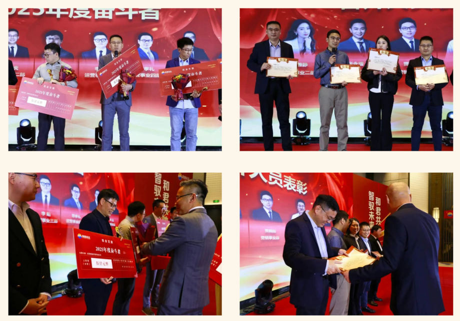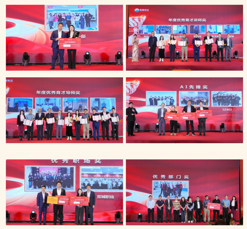 表彰大会正式开始,各领导依次上台,为年度奋斗者、年度晋升之星、年度优秀育才奖、年度品牌建设奖、年度 AI 赋能先锋奖、年度优秀职场人奖获得者及年度优秀部门奖获奖团队颁发荣誉。表彰环节以总裁高丽娟女士为运营事业四部颁发优秀部门奖圆满收官。